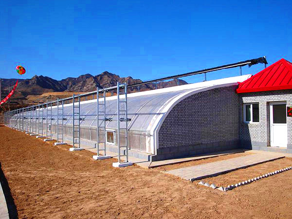 前坡面夜間用保溫被覆蓋,東、西、北三面為圍護(hù)墻體的單坡面塑料溫室,統(tǒng)稱為日光溫室。其雛型是單坡面玻璃溫室,前坡面透光覆蓋材料用塑料膜代替玻璃即演化為早期的日光溫室。日光溫室的特點(diǎn)是保溫好、投資低、節(jié)約能源,非常適合我國經(jīng)濟(jì)欠發(fā)達(dá)農(nóng)村使用。
